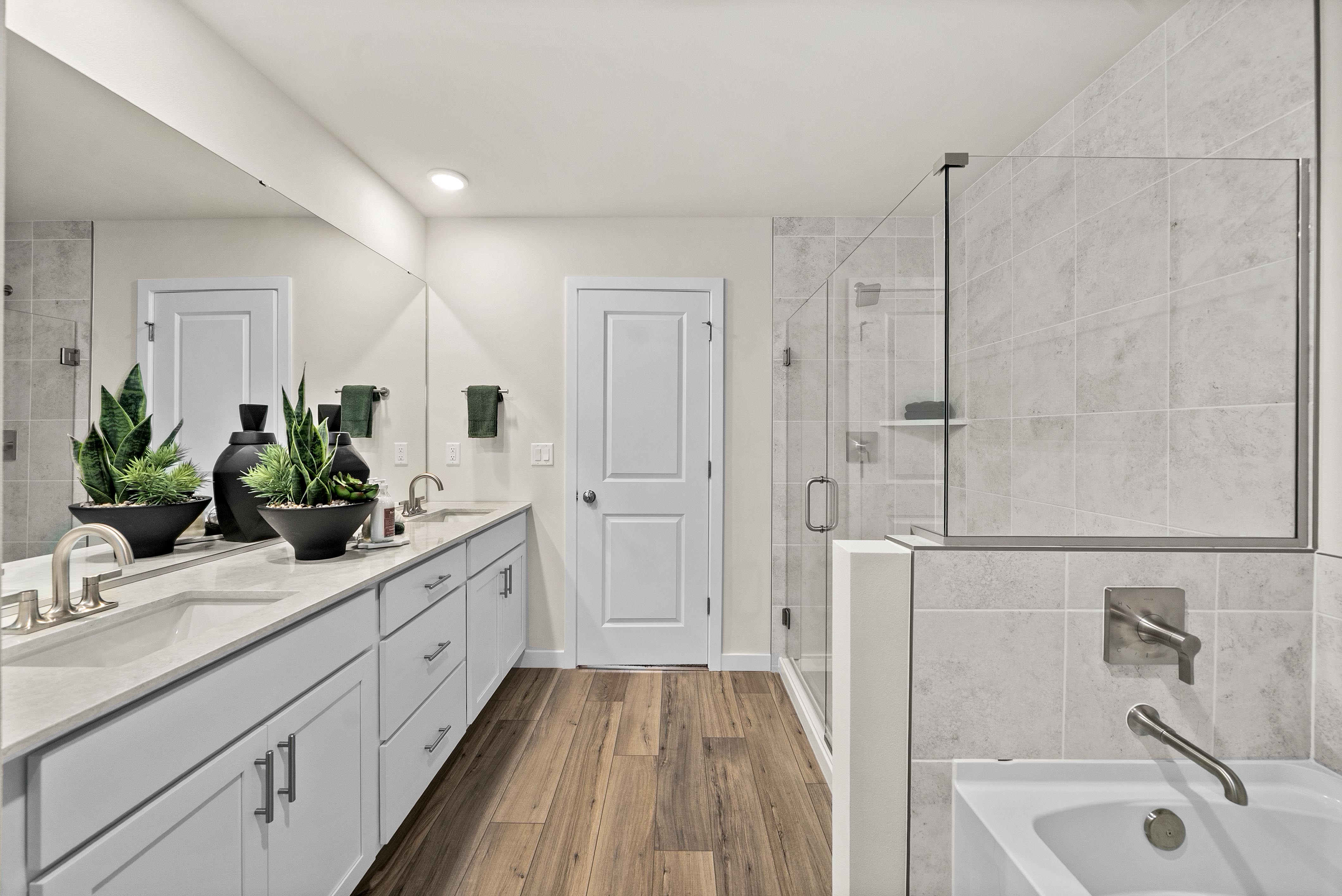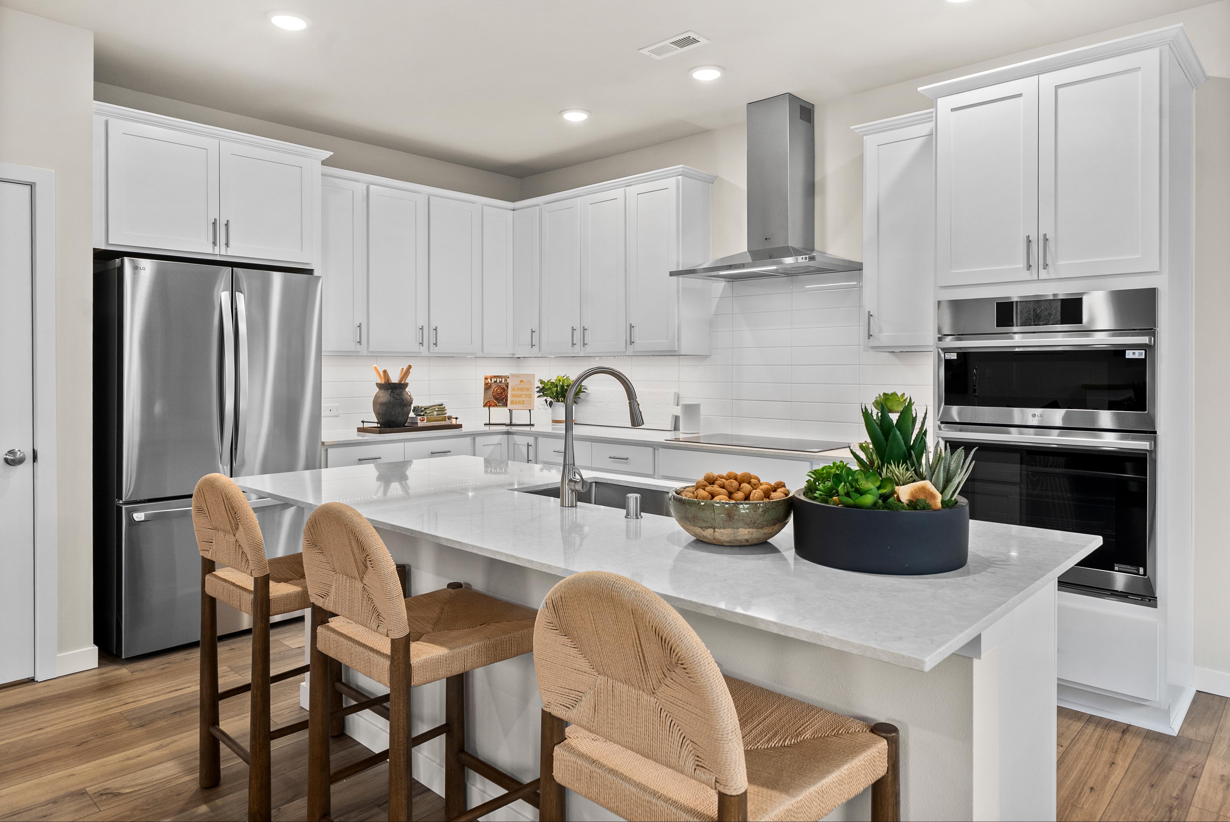 Showcasing thoughtfully designed two-story floor plans, these homes highlight modern features that blend comfort and innovation. Enjoy stylish quartz countertops in the kitchen and primary suite, premium stainless-steel appliances—including a electric cooktop with a 36” wall-mount range hood and smart Wi-Fi oven/microwave combo—plus 34.5-inch cabinets with molding, soft-close doors, pulls, and under-cabinet lighting.
